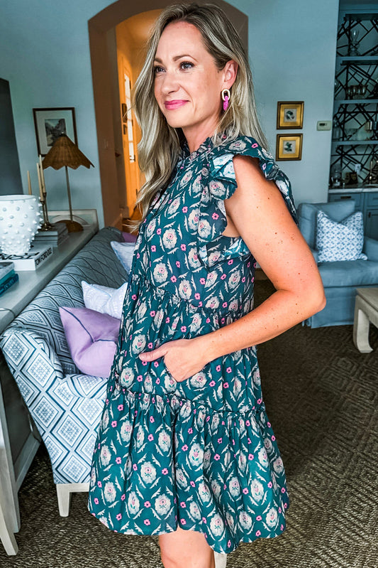 Blue Retro Floral Print Split Neck Ruffle Short Sleeve Dress
