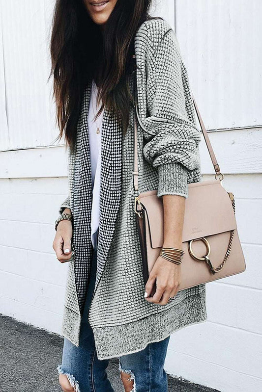 Grey Plaid Contrast Trim Casual Knit Cardigan