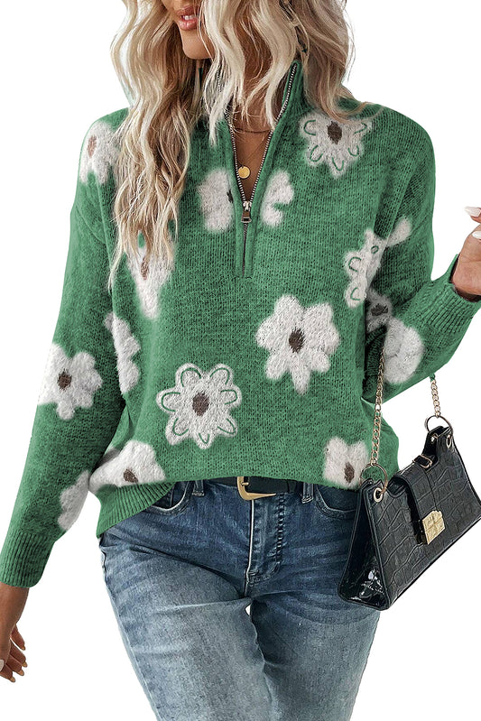 Green Vintage 60s Floral Pattern Half Zip Collar Drop Shoulder Sweater