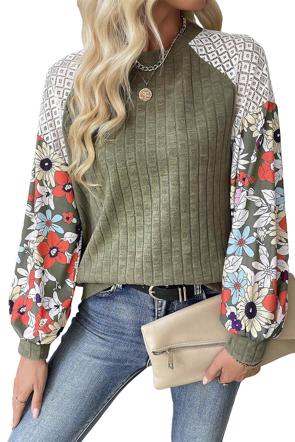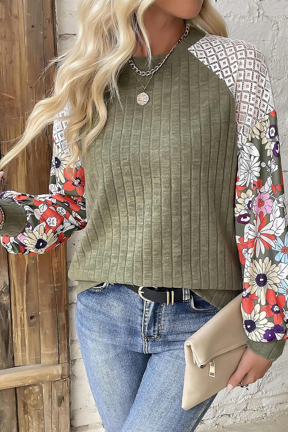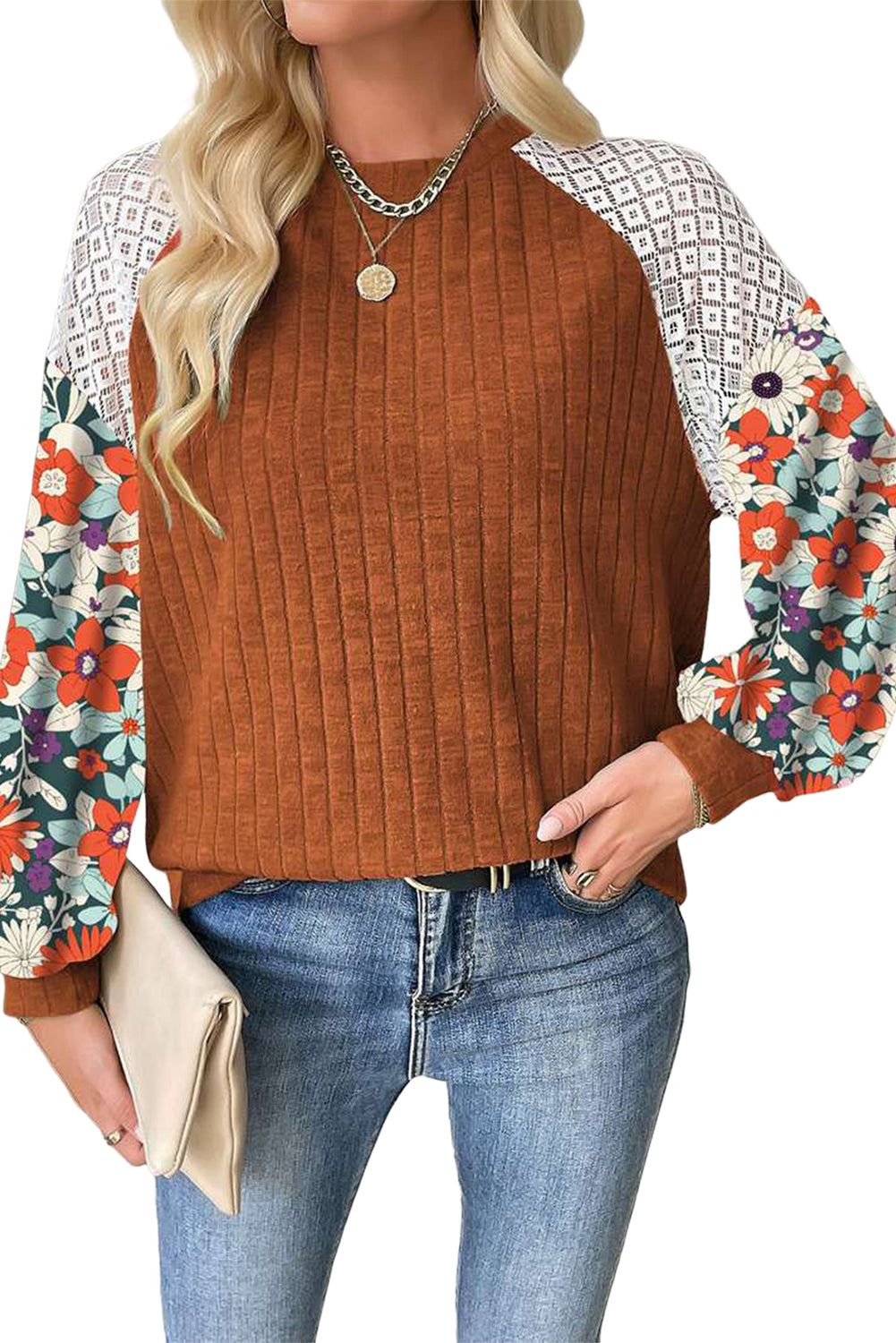 Cinnamon Floral Patchwork Raglan Sleeve Ribbed Top