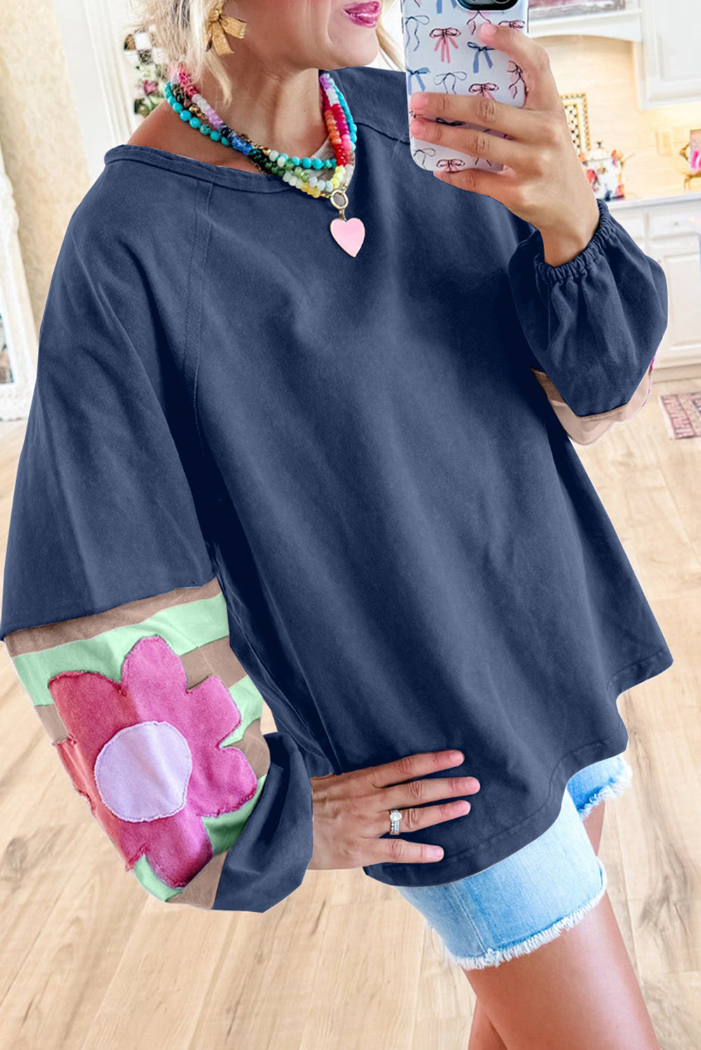 Smoke Green Flower Patchwork Exposed Seam Raglan Sleeve Top