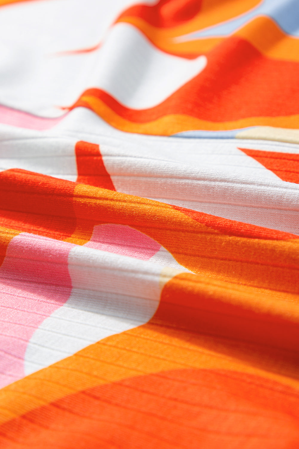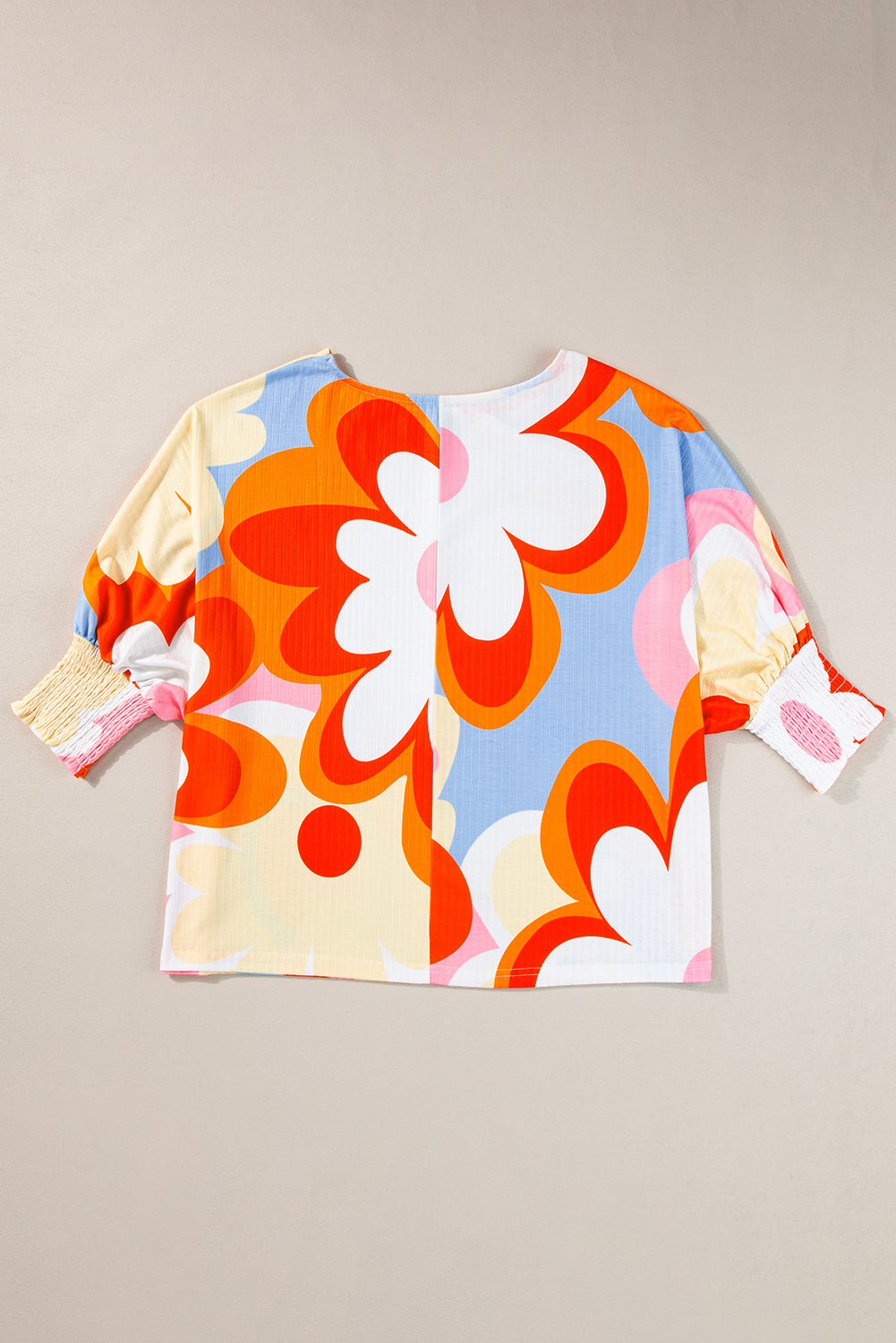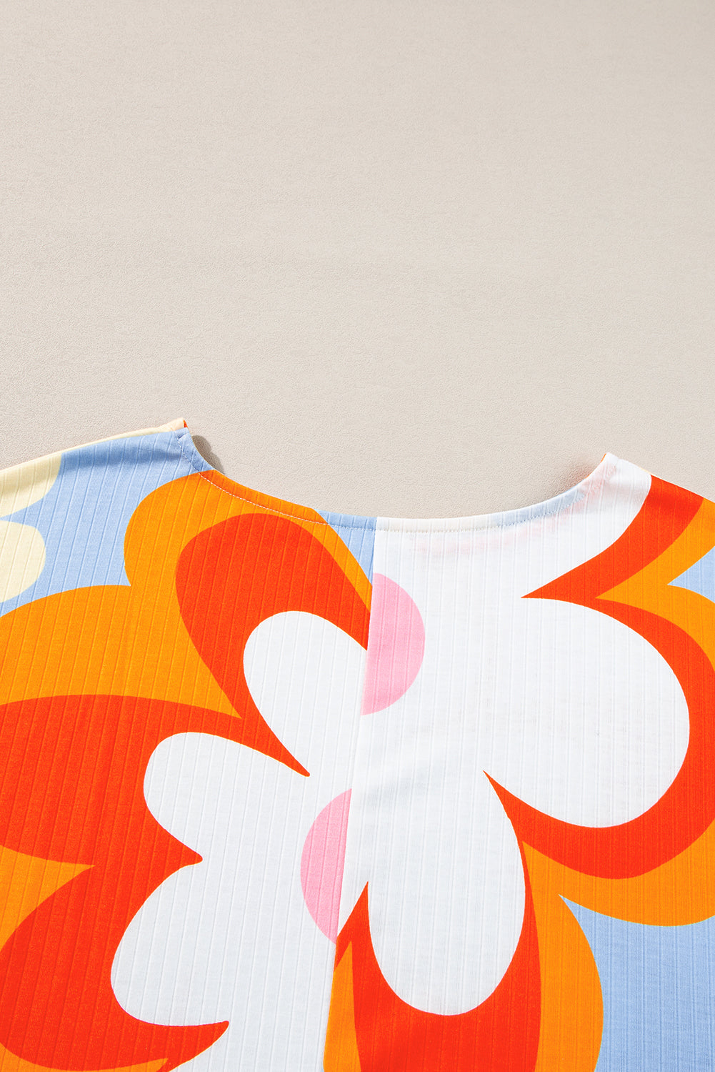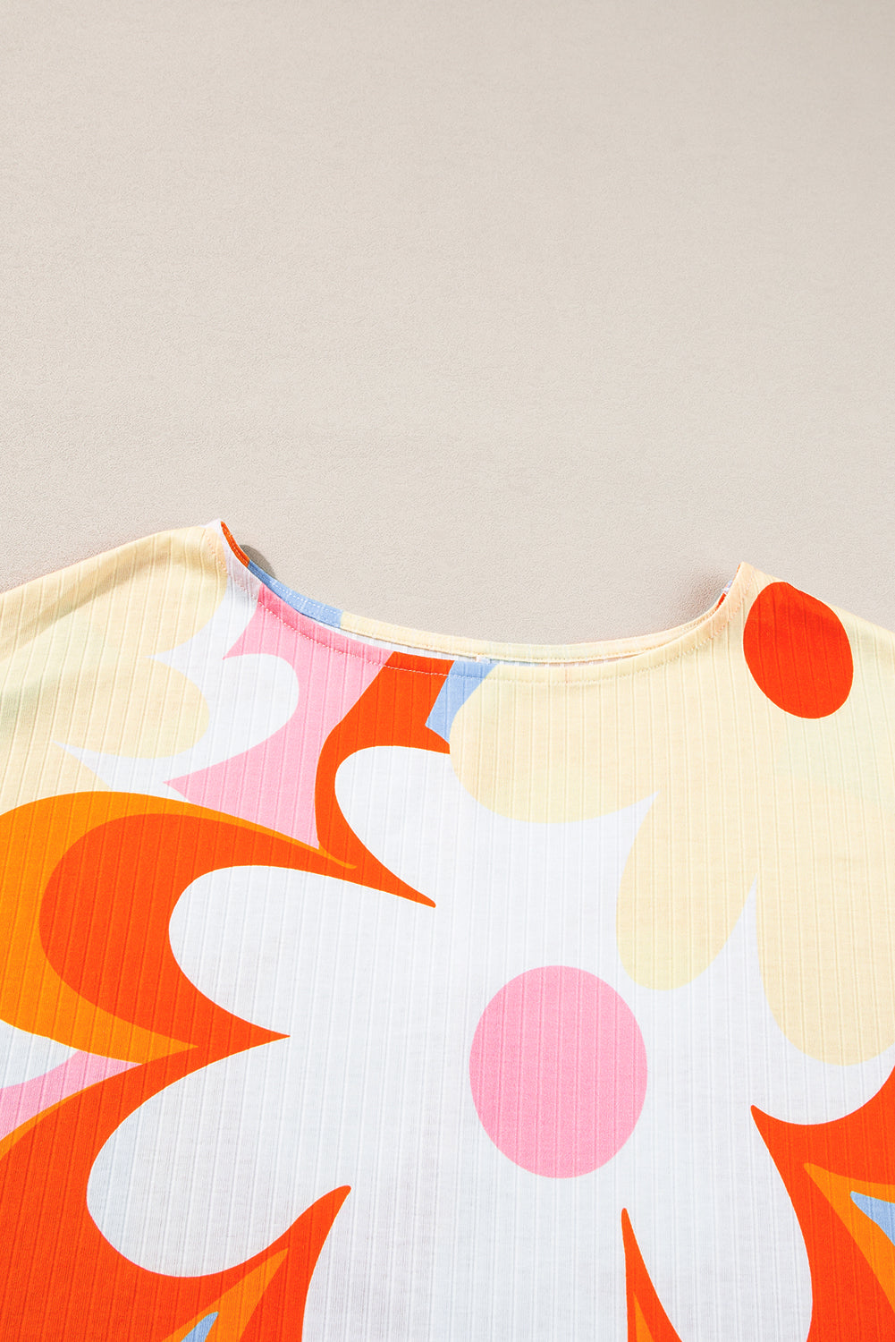 Yellow Colorful Floral Print Ribbed Dolman Blouse